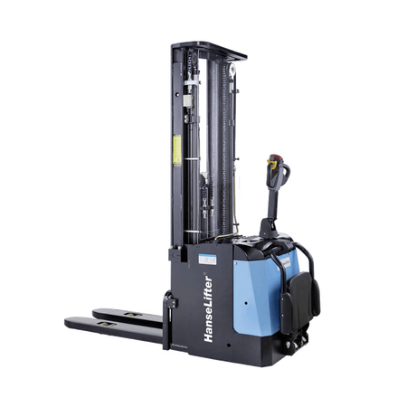 The E-DHT-S20PL electric pallet stacker is equipped with a triplex mast and can reach a lifting height of between 3000 and 5500 mm. The maintenance-free and powerful three-phase drive motors provide optimal performance and goods handling. High-quality components as well as a Zapi controller for ride on operation are also part of the standard equipment.