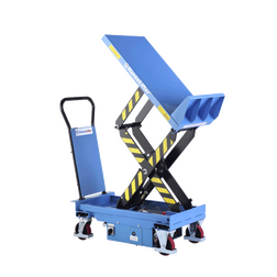 The E-NHT series tilting lift tables are particularly suitable for equipping machines in production and for order picking. The tilt function of the E-NHT means that crates and boxes can be tilted, making it easier to fill or empty them. The control panel of the tilting lift tables can be removed and is equipped with an approx. 3 m long supply cable. E-NHT series tilting lift tables allow you to work ergonomically. Simply raise the goods to a height that is good for you. Electric lifting and lowering up to 600 kg with E-NHT series tilting lift tables.