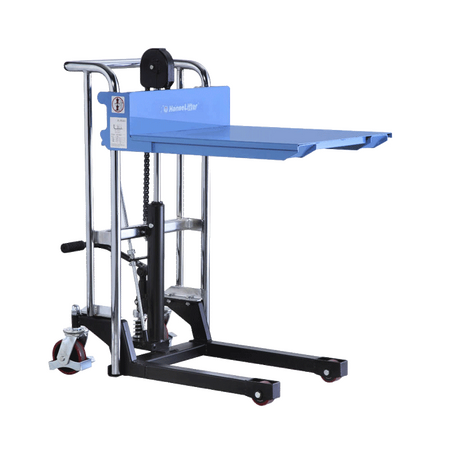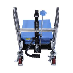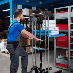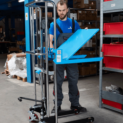 With a single movement, the platform which is included with the manual stackers can be easily attached and removed. This allows you to react quickly and flexibly to different work requirements. The low own weight of the PS0 manual fork/platform stackers and the compact storage dimensions make the manual stackers of the PS0 series ideal for being carried on a lorry to simplify loading and unloading. They are suitable for easy lifting and transporting and with the platform, they can be used as a working table to prevent back strain. With the PS0 manual series fork/platform stackers, a foot pedal is used for energy-saving lifting and continuous lowering can be controlled using a rotary knob.
