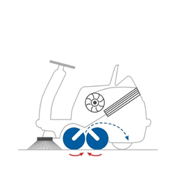 This sweeper model impresses with its effective tandem roller system (TRS) and its unsurpassed sweeping results under the most difficult conditions. The two counter-rotating brush rollers reliably pick up both fine dust and objects up to a size of 1 litre bottles, grip the dirt and throw it overhead into the rear dirt collector. This means that the collector is filled to 90% and used effectively.